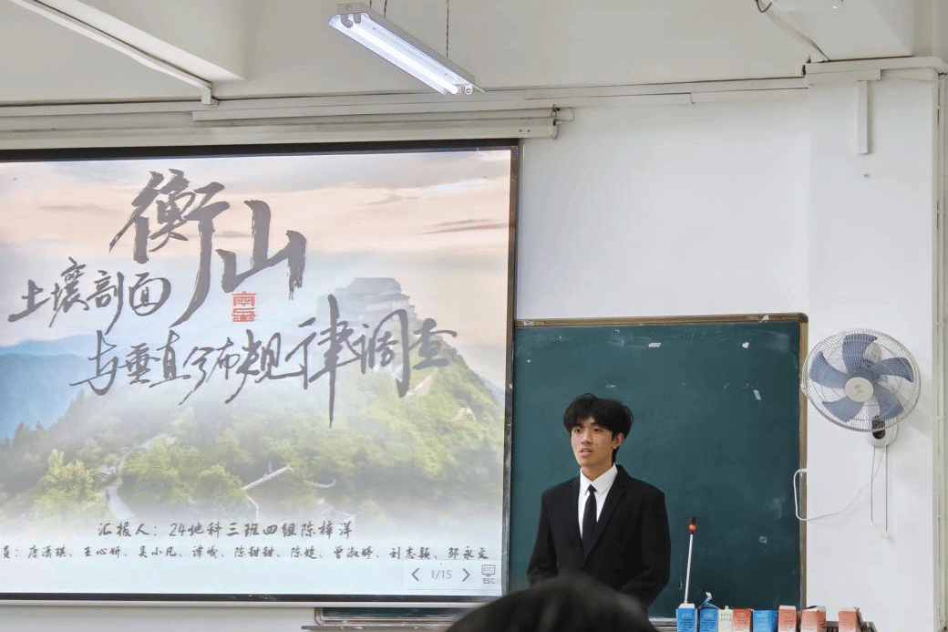经过前期初赛与复赛的层层筛选,10支优秀小组脱颖而出,成功晋级本次决赛舞台。各决赛小组按抽签顺序依次开展成果汇报,专题各有侧重且亮点突出:聚焦河流地貌的小组,依托实地考察的数据,细致解析江心洲的形成机制与核心特征;深耕衡山植物区系与植物群落调查的小组,以分类梳理的科学方法,清晰呈现植被分布规律;也有小组围绕土壤剖面分析和大型褶皱考察展开详实汇报。这些内容均是小组成员在实习阶段协作攻关、反复打磨的实践结晶。尽管汇报时长有限,但在这有限的时间里各小组均高效浓缩实习成果、清晰呈现研究重点。这场精炼且充实的展示,让在场师生充分领略到实践探索的价值,也生动彰显了地理科学专业“知行合一”的实践育人成效。