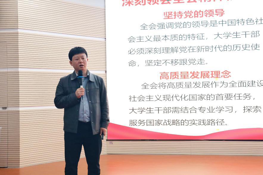 我院学工办主任兼团委书记阳宏润老师,结合党的二十届四中全会精神与同学探讨如何成为一名新时代优秀大学生干部,他着重指出,学生干部作为校园中的先锋力量,肩负着重要使命,应当筑牢思想政治根基,提升综合履职能力,践行服务同学宗旨,弘扬优良作风形象,同时需要强化组织纪律观念,将个人发展融入国家发展实践。从身边细微小事做起,于平凡中彰显不凡。以青春之我、奋斗之我,为民族复兴铺路架桥,为国家发展贡献青春力量。